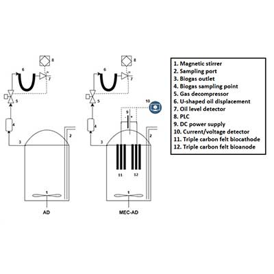 This project explores the synergistic effect of hydrogen injection and applied potential in an MEC- AD reactor, on biogas production rate and quality. Additionally, a prototype MEC-AD bioreactor with multiple cathode electrodes is constructed and operates for higher exploitation of the AD bulk. All systems are assessed in terms of biogas production rate and quality and wastewater treatment under various operational parameters (gas feeding rate, gas diffusion system, different operation modes, gas flow rate,different types of real wastewaters, applied voltage, number of cathode electrodes for the MEC-AD units etc.)