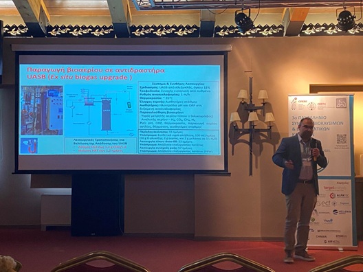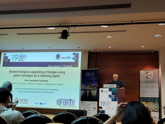 The innovation and significance of the GREENUPGRADE project were highlighted through the experience and expertise of Professors Gerasimos Lyberatos and Anestis Vlysides, who presented and promoted the project’s objectives and outcomes at both international and national conferences. Specifically, professor Anestis Vlysides presented orally (Figure 3) the work titled “Development of alternative ways to utilize green hydrogen for upgrading biogas produced during anaerobic digestion of waste and biomass” at 3rd Panhellenic Conference on Biofuels and Alternative Fuels, May 15-16, 2025, Lake Plastira. Furthermore, professor Gerasimos Lyberatos performed a plenary speech (Figure 4) titled “Biotechnological upgrading of biogas using green hydrogen as a reducing agent” at International Conference on Environmental Science and Technology (CEST2025), Kos island, Greece 3 / 6 September 2025.