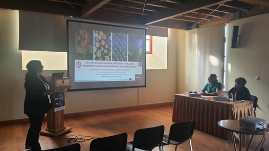 Dissemination of WP1 was performed primarily in international scientific conferences focused on environmental science, environmental technologies, circular economy and sustainability. Specifically, Dr. Pavlopoulos Charalampos presented orally (Figure 1) the work titled “Biogas upgrade with green hydrogen in a semi-pilot trickle bed reactor” at 19th International Conference on Environmental Science and Technology, Kos, Greece. Additionally, Dr. Konstantina Papadopoulou presented orally (Figure 2) the work titled “CO2 capture and biological conversion to CH4 using hydrogenotrophic methanogens in a trickle bed reactor” at 2nd International Conference: Circular Economy – The pathway towards a Sustainable Development, Chania, Greece.